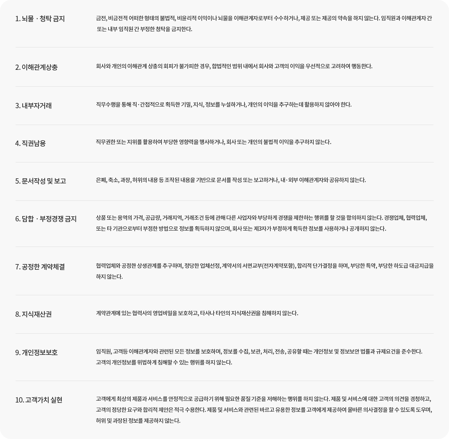투비소프트는 윤리경영을 기업경영의 근간으로 삼아, 다양한 이해관계자의 믿을 수 있는 파트너가 되고, 고객의 가치를 높일 수 있도록 노력하겠습니다. 투비소프트의 모든 구성원들은 임직원은 본 윤리헌장을 경영활동에서 의사결정과 행동의 판단기준으로 삼도록 합니다.