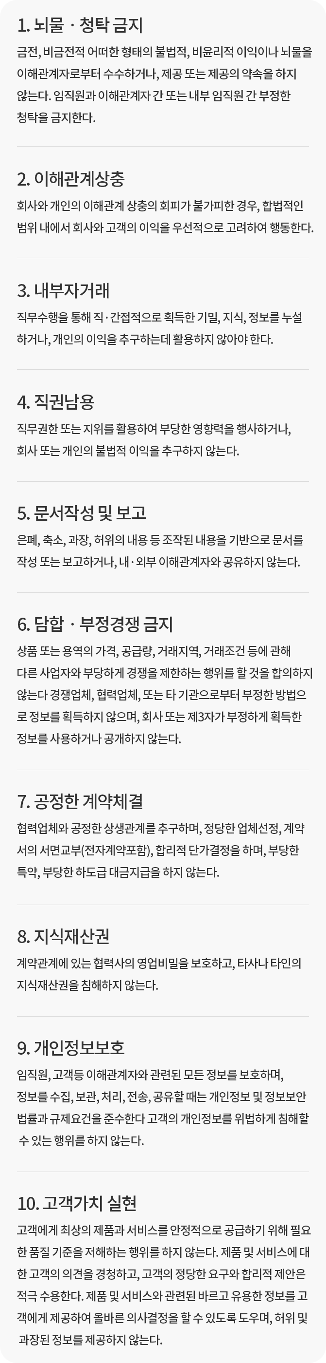 투비소프트는 윤리경영을 기업경영의 근간으로 삼아, 다양한 이해관계자의 믿을 수 있는 파트너가 되고, 고객의 가치를 높일 수 있도록 노력하겠습니다. 투비소프트의 모든 구성원들은 임직원은 본 윤리헌장을 경영활동에서 의사결정과 행동의 판단기준으로 삼도록 합니다.